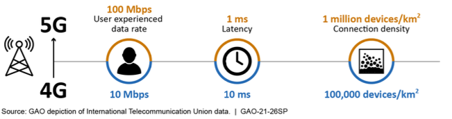 Fifth-generation (5G) wireless networks promise to provide significantly greater speeds and higher capacity to accommodate more devices. In addition, 5G networks are expected to be more flexible, reliable, and secure than existing cellular networks. The figure compares 4G and 5G performance goals along three of several performance measures.