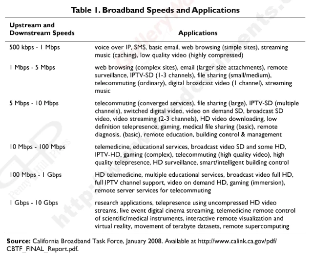 Broadband speeds (and prices) are important factors that can determine which technologies are deployed, which applications will be enabled, and how widespread deployment will be. Table 1 shows different broadband speed ranges and the applications they make possible.