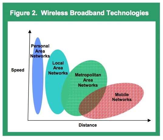 Fixed or portable wireless broadband access technologies fall within three principal categories of networks, defined principally by the short, medium, or longer-range of coverage capabilities for which they are optimized. As general matter, there are three basic types of such wireless networks: (1) wireless personal area networks (WPANs), with network links typically shorter than 10 meters; (2) wireless local area networks (WLANs), with individual network links that can span up to three miles, and (3) wireless metropolitan area networks (WMANs), with individual network links that can span distances of up to 30 miles.
