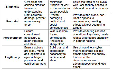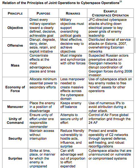 Below is a matrix portraying how the principles of joint operations can be expressed and demonstrated through cyberspace operations.