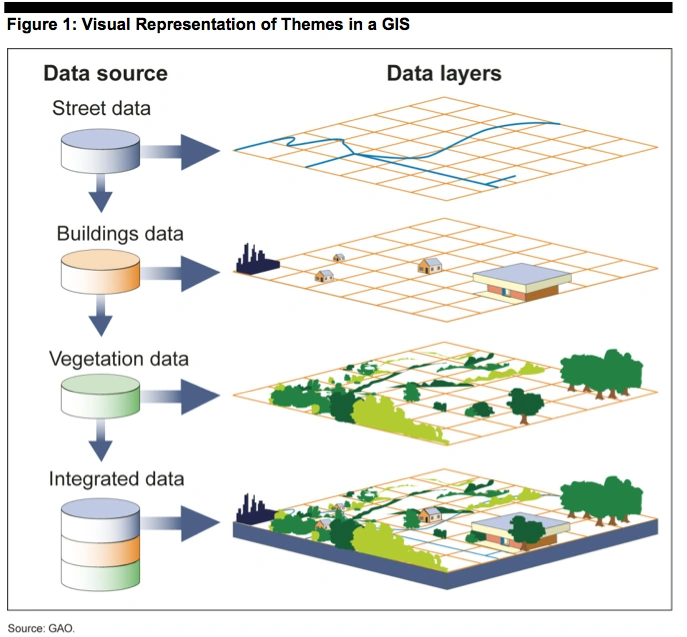 Each layer of a GIS map represents a particular “theme” or feature, and one layer could be derived from a data source completely different from the others. For example, one theme could represent all of the streets in a specific area. Another theme could correspond to all of the buildings in the same area, and others could show vegetation or water resources. As long as standard processes and formats have been used to facilitate integration, each of these themes could be based on data originally collected and maintained by a separate organization. Analyzing this layered information as an integrated whole can significantly aid decision makers in considering complex choices, such as where to locate a new department of motor vehicles building to best serve the greatest number of citizens.