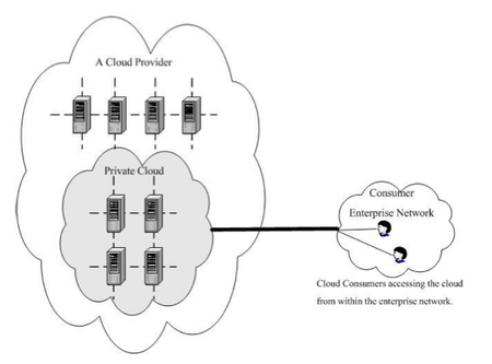 A private cloud gives a single cloud consumer's organization the exclusive access to and usage of the infrastructure and computational resources. It may be managed either by the cloud consumer organization or by a third party, and may be hosted on the organization's premises (i.e., on-site private clouds) or outsourced to a hosting company (i.e., outsourced private clouds).