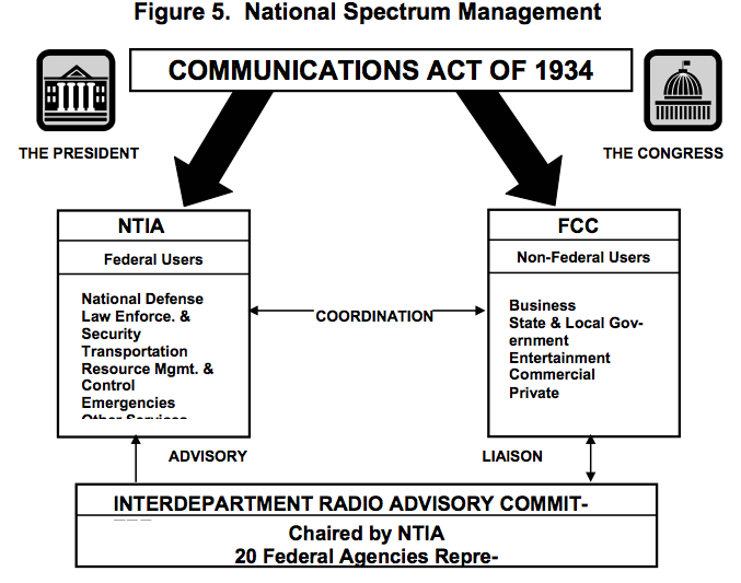 Radio frequency spectrum is managed by the Federal Communications Commission (FCC) for commercial and other non-federal uses and by the National Telecommunications and Information Administration (NTIA) for federal government use.